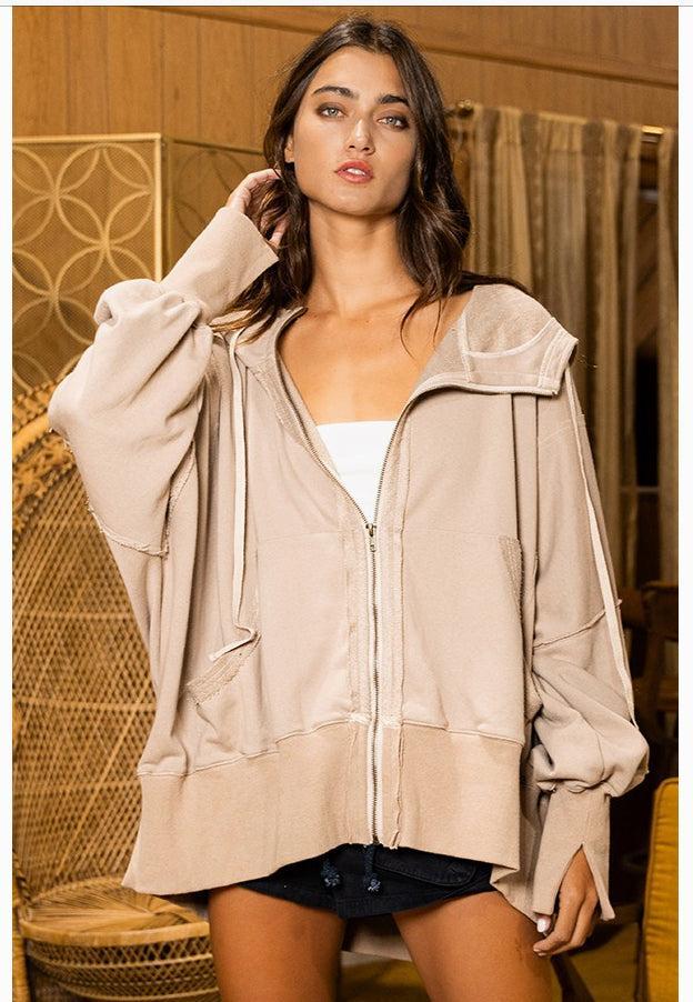 Embrace the thrill of the unknown with the Mineral Washed French Terry Zip-up Oversize Jacket! Wrap yourself in its premium fabric, perfect for those daring adventures. The hood, long sleeves with thumb holes, and raw edges add a dash of attitude. Stash your essentials in side pockets and conquer the day!